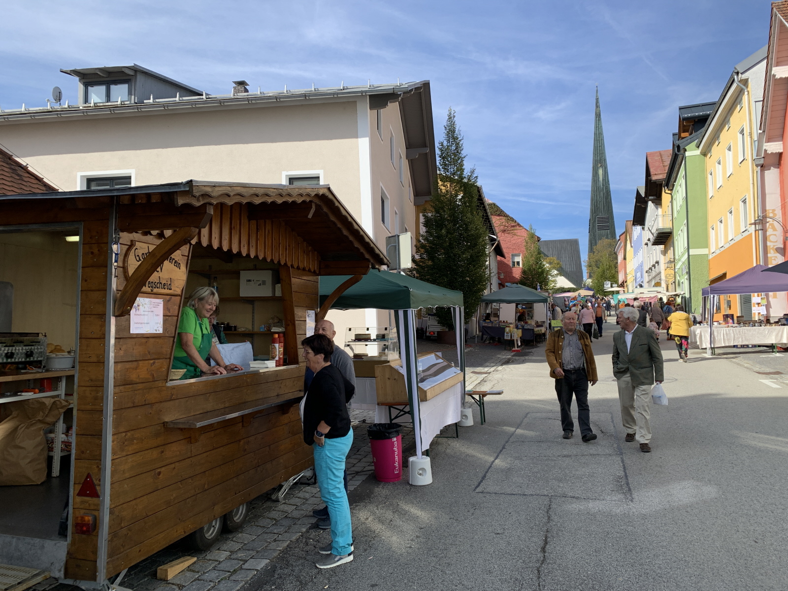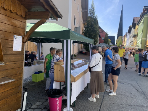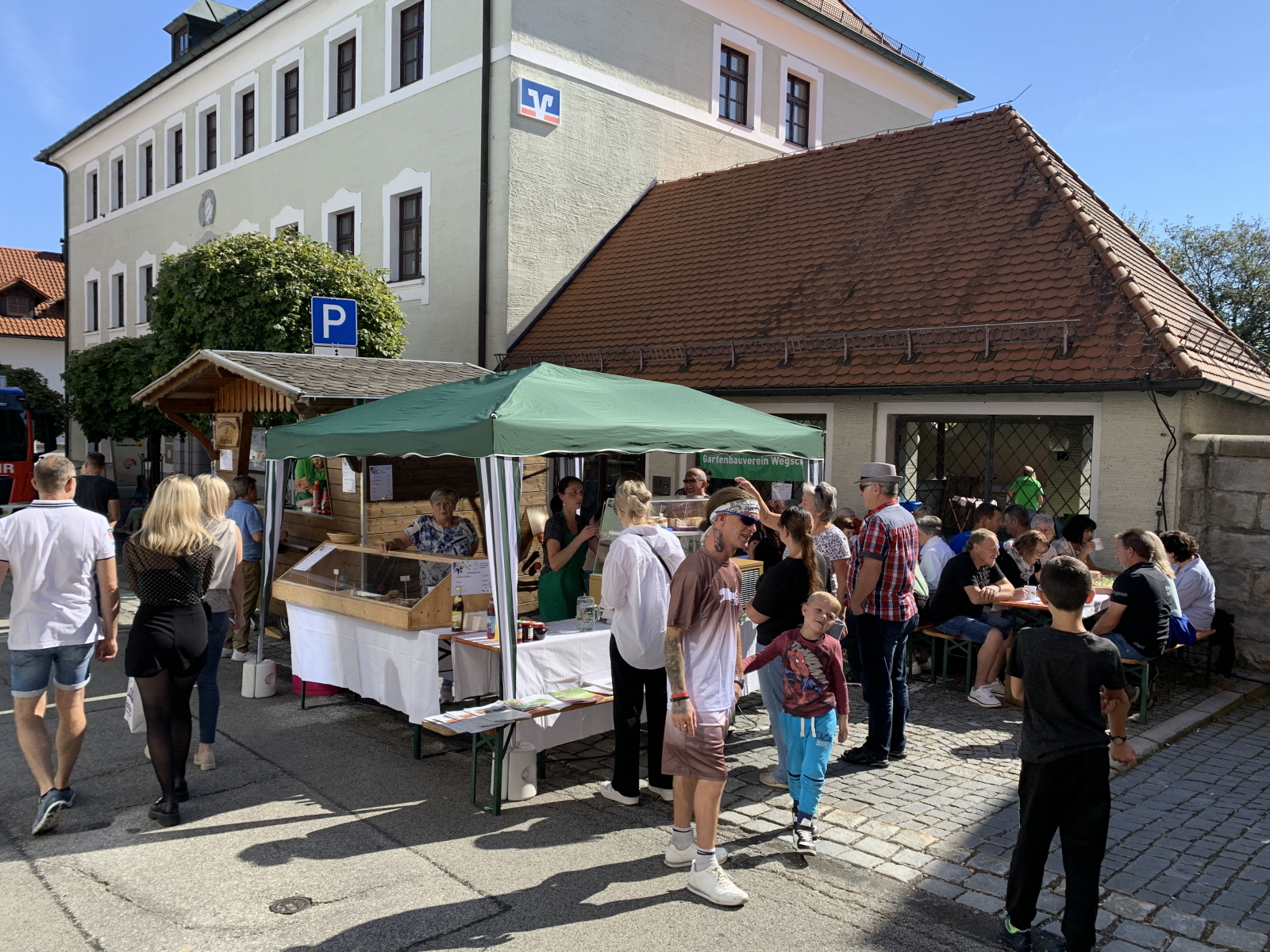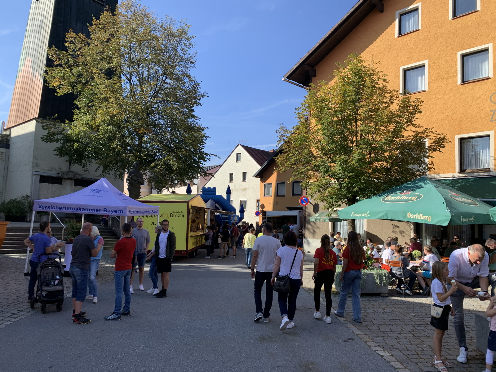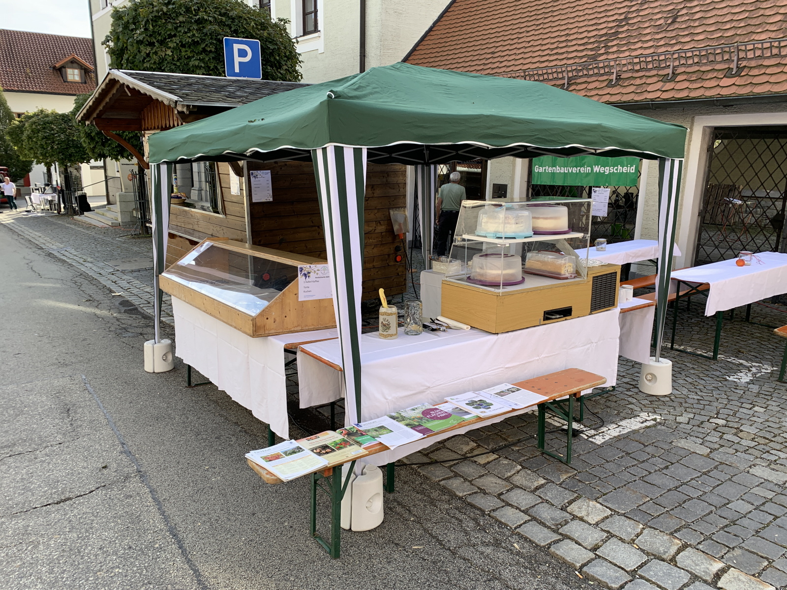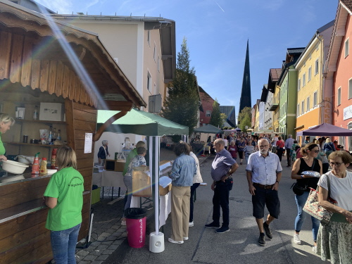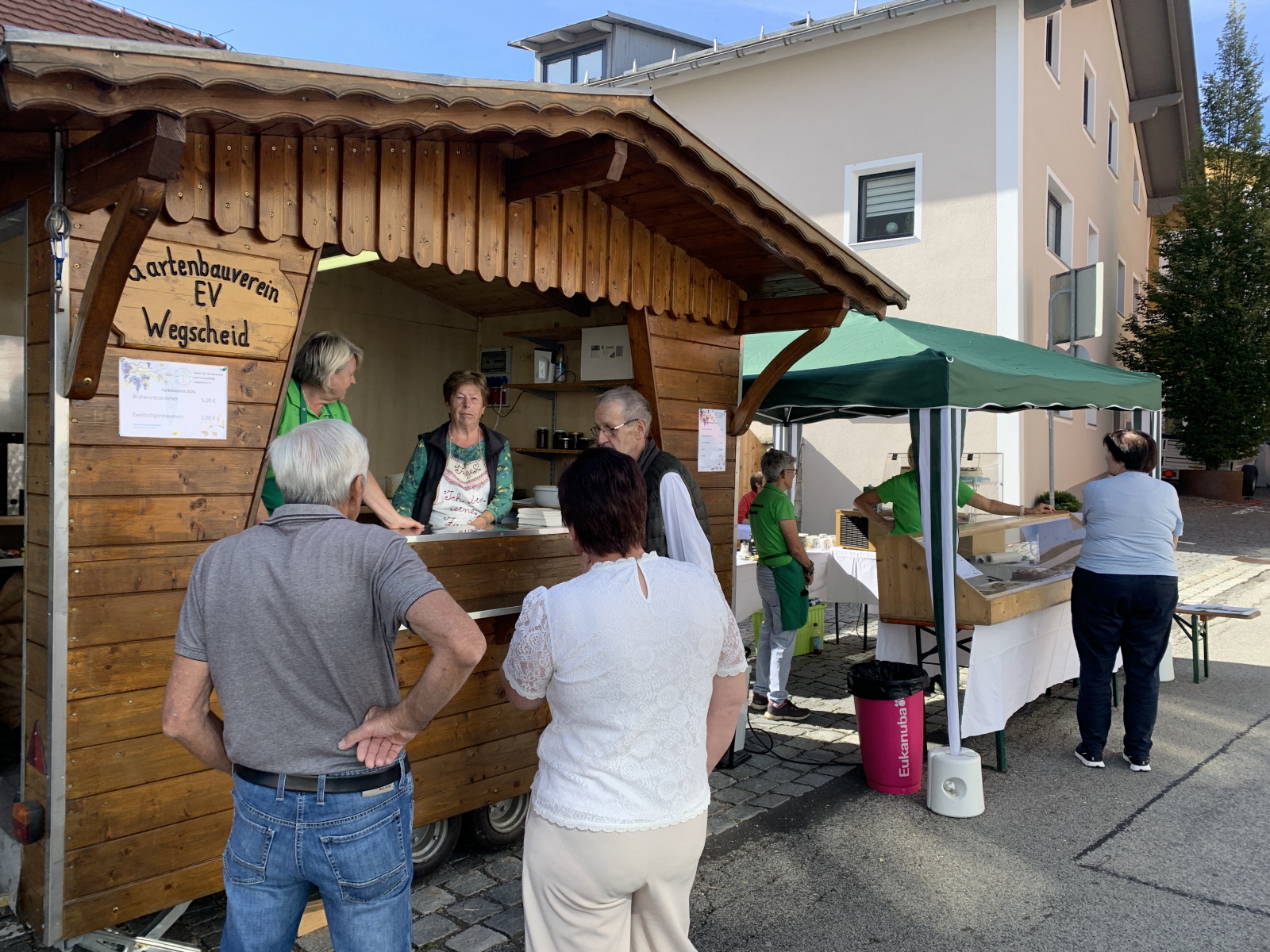 Nachdem letztes Jahr der Herbstmarkt ausgefallen ist, war dieses Jahr bei schönstem Wetter wieder kräftig was los. Traditionell haben wir unseren Verkaufswagen und Pavillion bei der Raiffeisenbank aufgebaut. Die Besucher wurden mit Kaffee und Kuchen, sowie Bratwürsten und Zwetschgenbavesen bewirtet. Die Kuchen und Torten waren wie schon beim Frühlingsmarkt sehr beliebt und bereits um 15 Uhr ausverkauft. Die Marktbesucher stürzten sich dann auf die Zwetschgenbavesen, so dass Inge kaum mehr mit dem Nachschub hinterher kam.