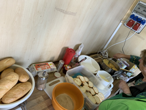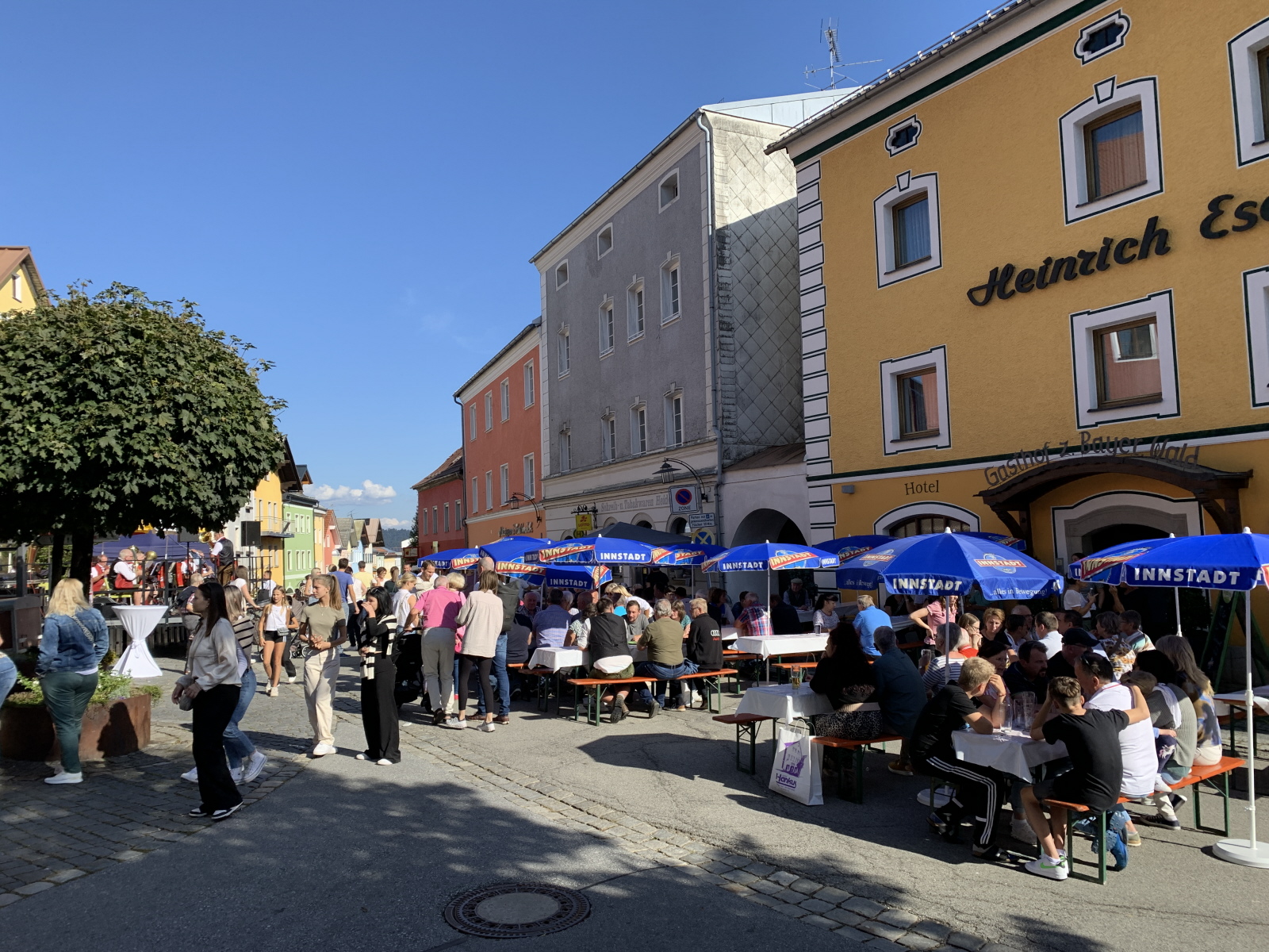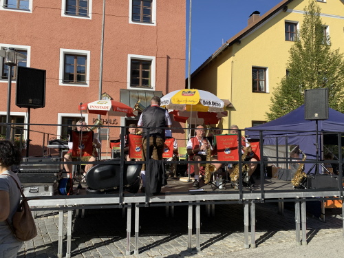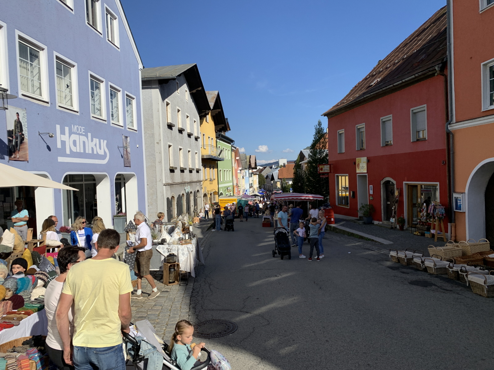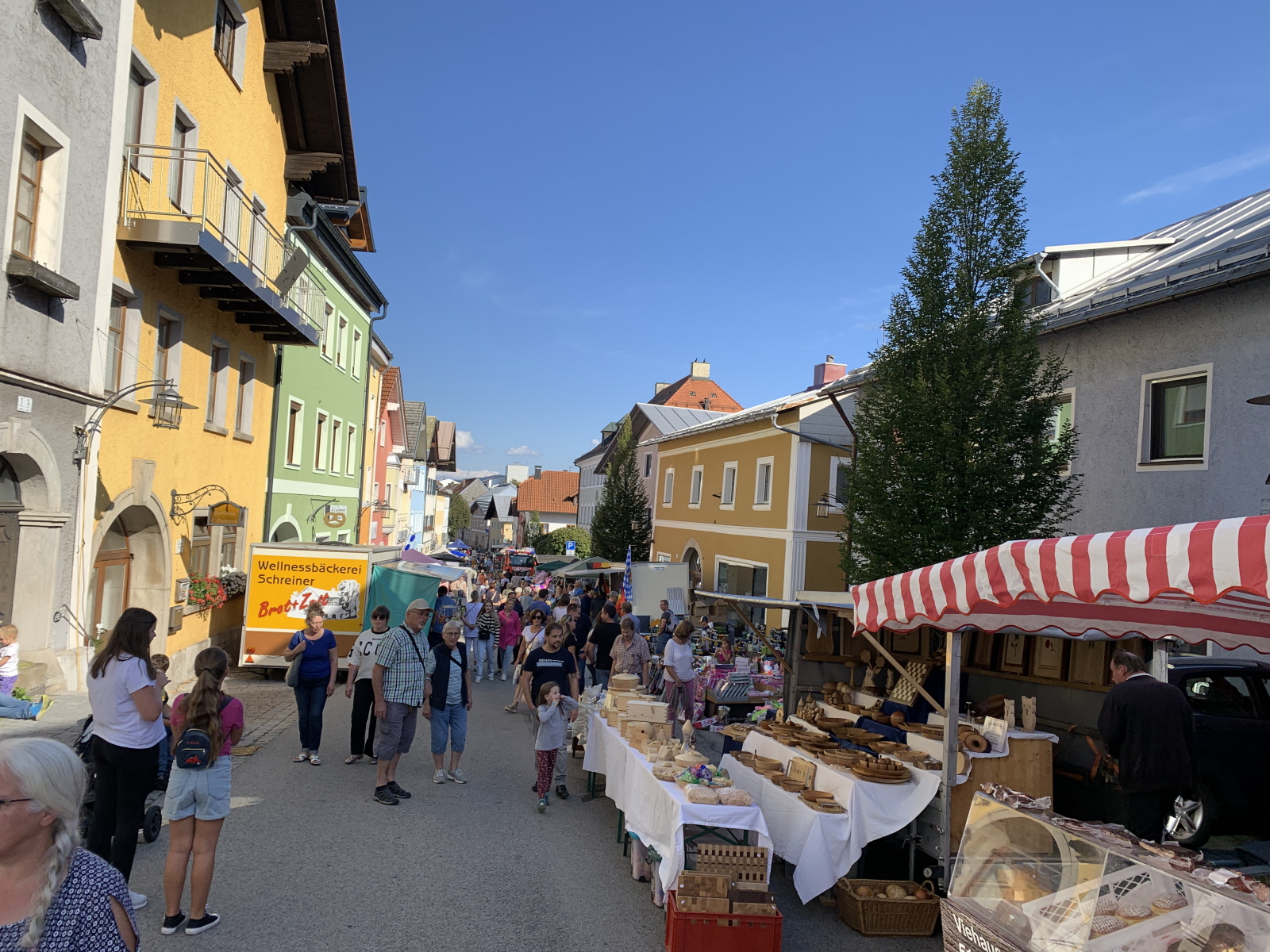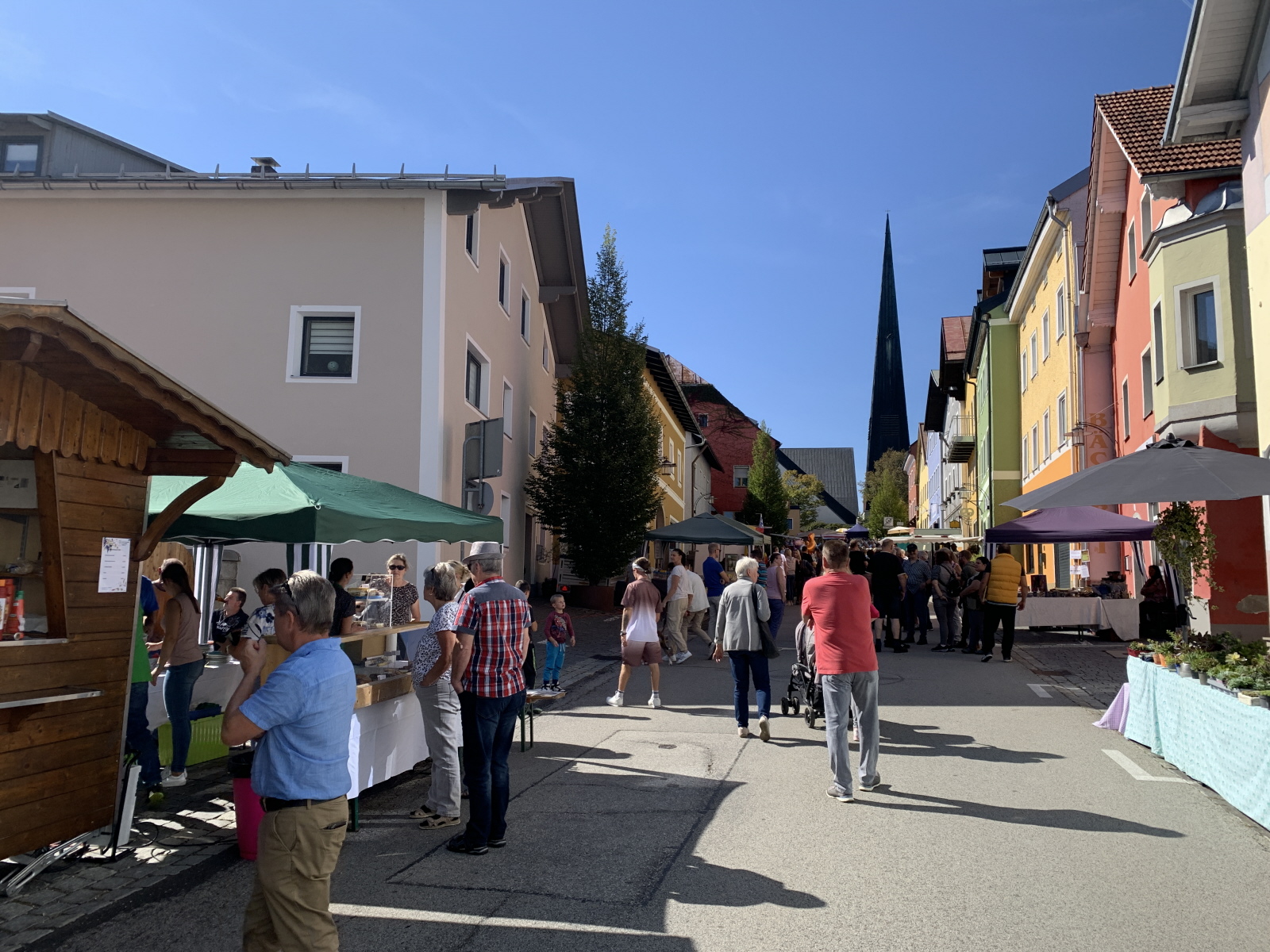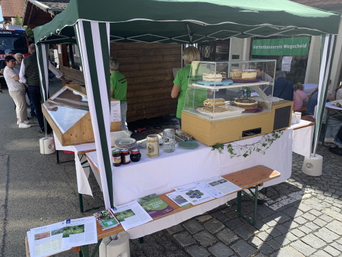 Nachdem letztes Jahr der Herbstmarkt ausgefallen ist, war dieses Jahr bei schönstem Wetter wieder kräftig was los. Traditionell haben wir unseren Verkaufswagen und Pavillion bei der Raiffeisenbank aufgebaut. Die Besucher wurden mit Kaffee und Kuchen, sowie Bratwürsten und Zwetschgenbavesen bewirtet. Die Kuchen und Torten waren wie schon beim Frühlingsmarkt sehr beliebt und bereits um 15 Uhr ausverkauft. Die Marktbesucher stürzten sich dann auf die Zwetschgenbavesen, so dass Inge kaum mehr mit dem Nachschub hinterher kam.