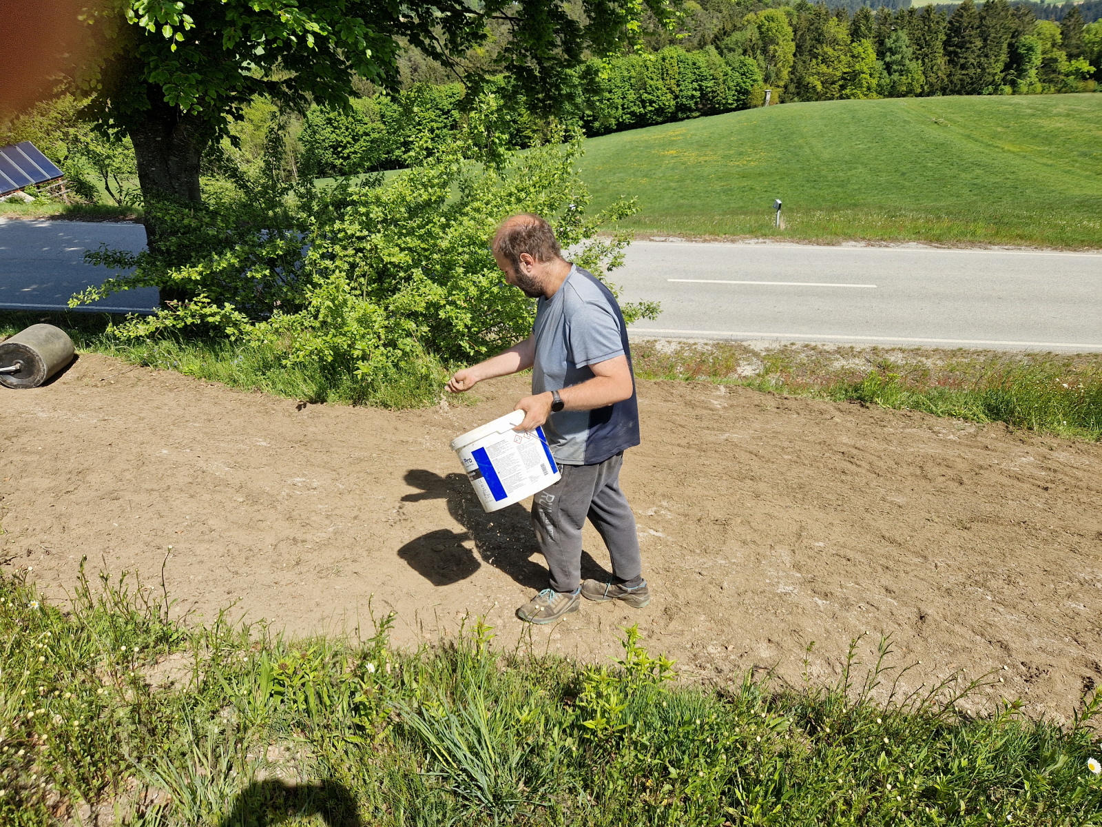 Zunächst wird der Boden etwa 5 cm tief mit der Fräse gelockert, aber nicht zu fein. Ein sonniger Standort ist bevorzugt. Das Saatgut wird mit Sand auf das 5- bis 10-fache Volumen gestreckt um eine bessere Verteilung zu gewährleisten, und zur Kontrolle ob der Boden gleichmäßig und gut bedeckt wird. Die 125 g der verwendeten Mischung reichen z.B. für etwa 30 m². Die Aussattiefe beträgt 0,5 bis 1,5 cm. Nach der Aussaat wird der Boden mit der Gartenwalze leicht verdichtet. In den ersten 3 bis 4 Wochen ist dann auf genügend Feuchtigkeit zu achten.