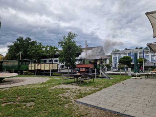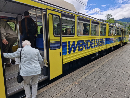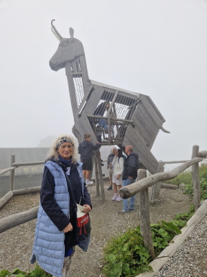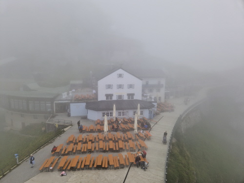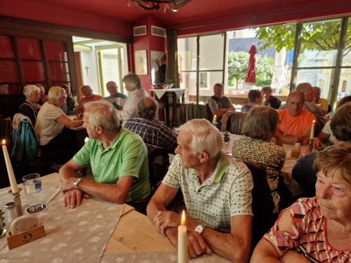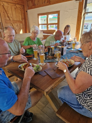 Endlich kam die Sonne hervor und so konnten wir am Waginger See die erste Brotzeitpause machen. Es gab Knacker mit Brezen und Bier, Kaffee und Kuchen. Marianne Reisinger, Sigrid Donaubauer und Irmengard Url hatten wieder fleißig gebacken und die anderen Mitglieder hatten Bier und Kaffee gesponsert. Gestärkt ging es dann weiter zur Zahnradbahn auf den Wendelstein. Da es bei der Fahrt sehr neblig war, konnte man die steilen Abhänge nicht sehen, zum Glück für einige Mitglieder. Nach 30 Minuten kamen wir am Berggasthof an. Wir besichtigten die Kapelle und die trojanische Gams. Einige erklommen den Gipfel und besichtigten die Höhle. Da leider keine Chance auf eine klare Sicht bestand, ging es um 15 Uhr wieder mit Deutschlands ältester Hochgebirgsbahn zum Tal zurück. Da noch Zeit blieb machten wir in Rosenheim Rast und gingen durch die wunderbare Fußgängerzone. Hier gab es viele Cafes und Restaurants bzw. Geschäfte. Einige Mitglieder gingen shoppen und andere blieben bei den vielen Eiskaffees sitzen und genehmigten sich einen Eisbecher und Apfelstrudel. Gegen 18 Uhr ging es dann in das Hotel Höhensteiger in Westerndorf zum Abendessen.