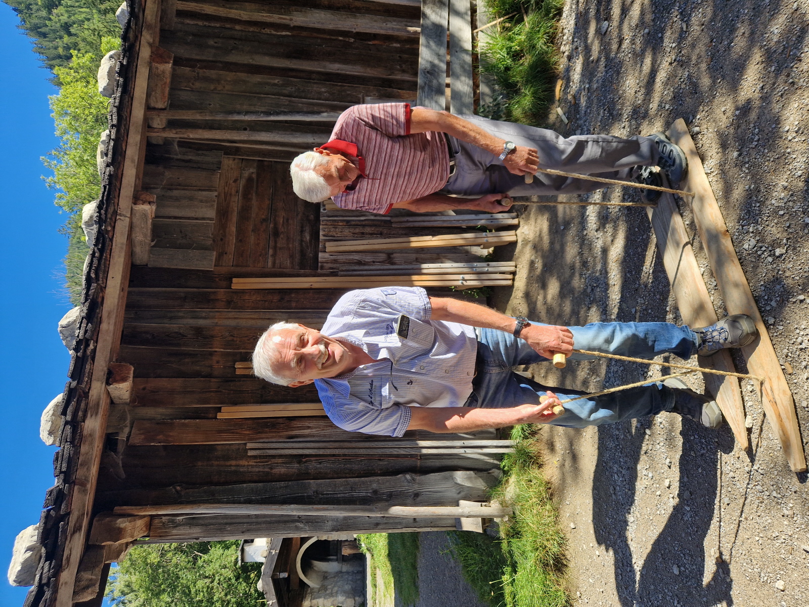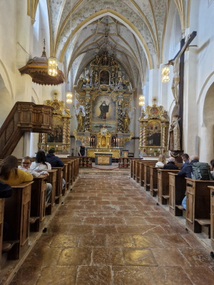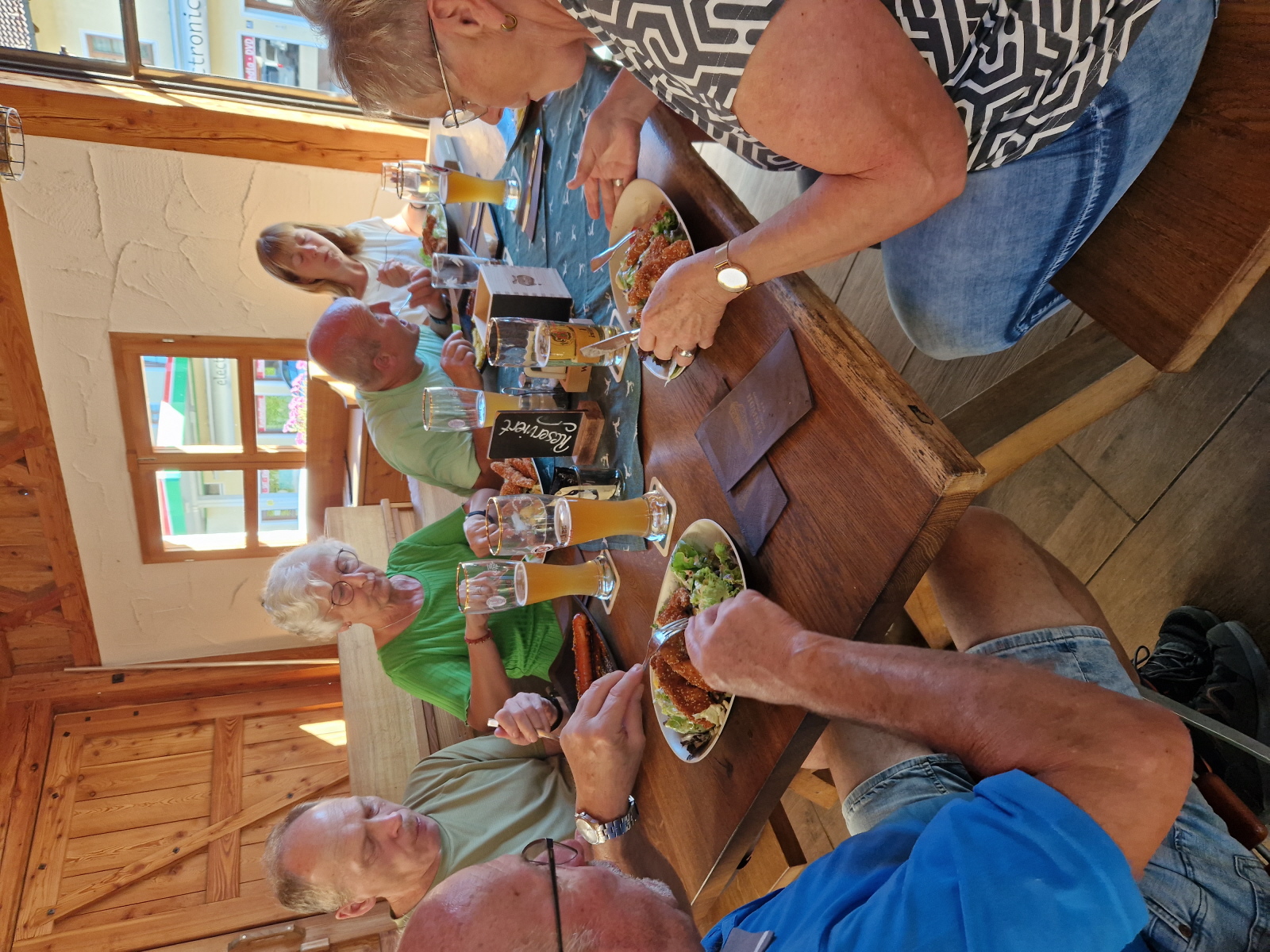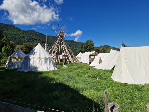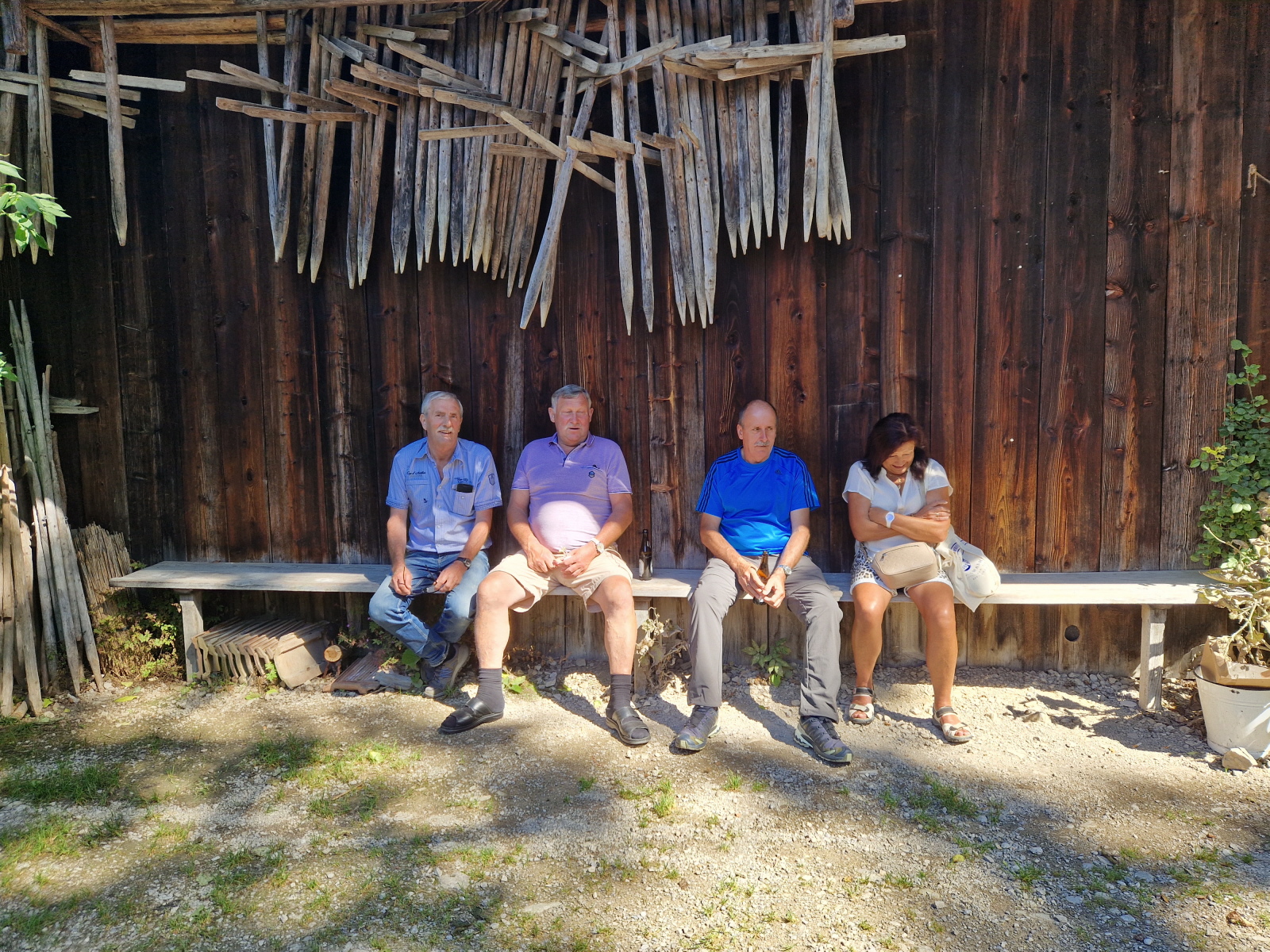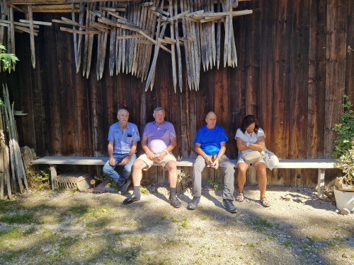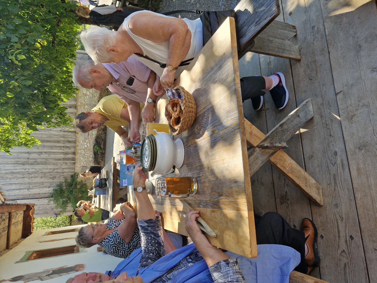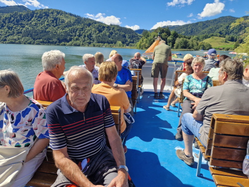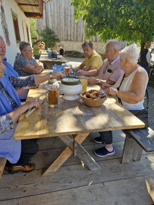 Dann ging es wieder zurück nach Rosenheim. Am letzten Tag erwartete uns ein sonniger warmer Tag. Wir fuhren Richtung Schliersee, hier machten wir noch einen kurzen Halt bei der Wallfahrtskirche St. Leonhard, sie besitzt nicht die übliche Ostung der Kirchen, sie wurde 1651 erbaut und ist bekannt für die Leonhardifahrt. Dann ging es weiter zum Wasmeier Museum. Seit Mai 2007 gibt es das 60000 qm große Dorf. Dort fand aktuell ein Mittelalterfest statt. Hier konnte man Ritterrüstungen bestaunen, und an einem Quiz teilnehmen, was es alles schon 1480 gab (Tomaten?, Klappmesser?, ...). Auf dem Rundgang des Geländes konnten wir verschiedene Häuser besichtigen, wie eine alte Brauerei, Geräte zum Buttermachen, eine alte Schule, man konnte einem Schmied bei seiner Arbeit zuschauen, einen Bauerngarten mit Kräuter besichtigen, Es gab viele Werkzeuge, die vielen von uns bekannt waren. Beim Gasthaus machten wir Rast auf ein Weißwurstfrühstück. Dann ging es weiter auf den Schliersee zu einer Fahrt mit dem Schiff. Anschließend gab es eine Brotzeit beim Bus, da noch einiges übrig geblieben war. Anschließend wurde mit dem Schlehlikör von Inge auf die gute Fahrt angestoßen. Auf der Heimfahrt machten wir nochmal Halt in Marktl am Inn beim Gasthaus Hummel. Im Biergarten wurden nochmal ausgiebig gespeist, bis es wieder nach Hause ging.