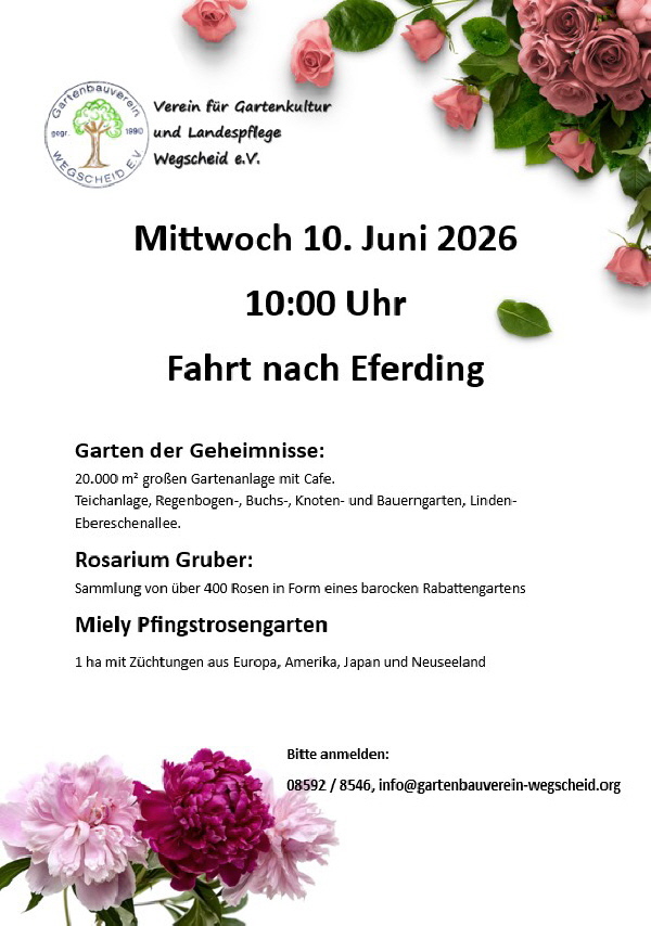 | Mittwoch 10.06.2026 10:00 Uhr | Fahrt nach Eferding https://www.eferdinger-gartenreisefuehrer.at/ ![]() Besuch von Garten der Geheimnisse: 20.000 m² großen Gartenanlage mit Cafe. Der Schaugarten spricht durch seine traumhafte Lage nicht nur Natur- und Gartenfreunde an, sondern er ist ein wahrer Kraftplatz um sich in der Ruhe der Natur zu entspannen und gleichzeitig Energien aufzuladen. Machen Sie einen Rundgang an der Teichanlage vorbei durch den Regenbogen-, Buchs-, Knoten- und Bauerngarten über die Rasenarena zur Linden-Ebereschenallee. Dabei können Sie den atemberaubenden Ausblick übers Eferdinger Becken bis tief ins Gebirge genießen. https://www.garten-der-geheimnisse.at/ Rosarium Gruber: Gemeinsam mit der ältesten Rosenschule Deutschlands, dem Rosenhof Schultheis, wurde eine Sammlung von über 400 Rosen in Form eines barocken Rabattengartens angelegt. Beim Rosenhof finden Sie die verschiedensten Arrangements von Rosen mit Stauden. Wir kultivieren jedes Jahr über 250 öfterblühende Rosensorten für Sie und bieten Ihnen über 700 Rosenbäumchen, sowie Rosenbegleitpflanzen der Gärtnerei Sarastro und Pfingstrosen von Miely´s Pfingstrosengarten. https://www.rosarium-gruber.at/ Miely Pfingstrosengarten: Seit 25 Jahren beschäftigen wir uns mit der Zucht und Pflege von Pfingstrosen. Auf unseren Schau und Experementierfeld von 1 ha Fläche laden wir Sie ein Ihre Favoriten zu suchen. Wir führen Sorten aus eigener Züchtung, Europa, Amerika, Japan und Neuseeland https://www.paeoniamiely.com/ Bitte bei Bonalinde Schramm oder Irmgard Hautzinger anmelden. ![]() |
