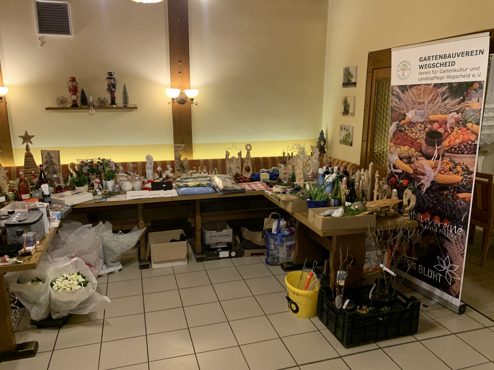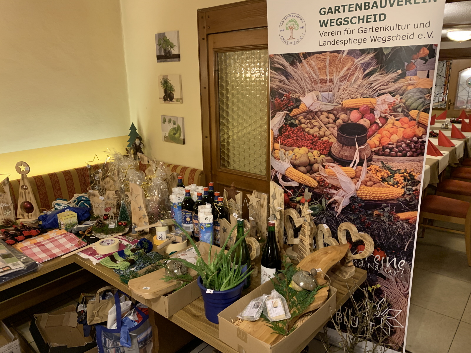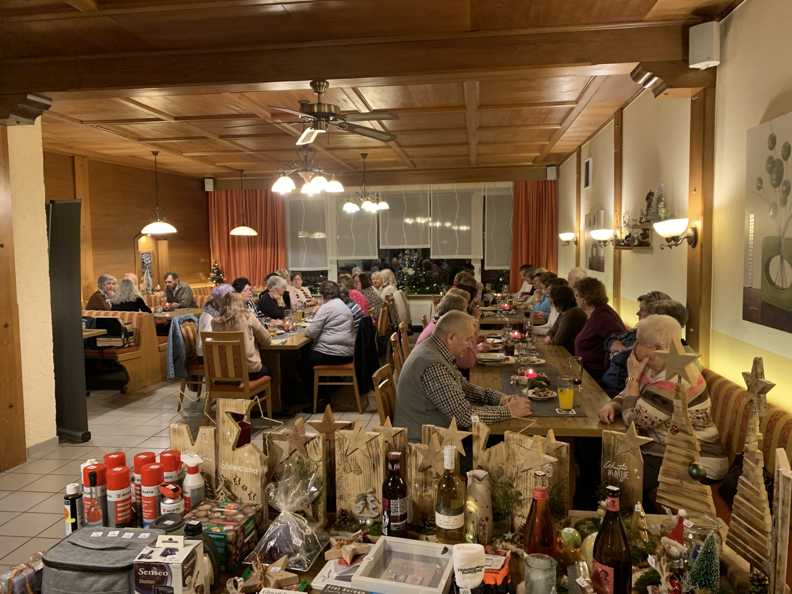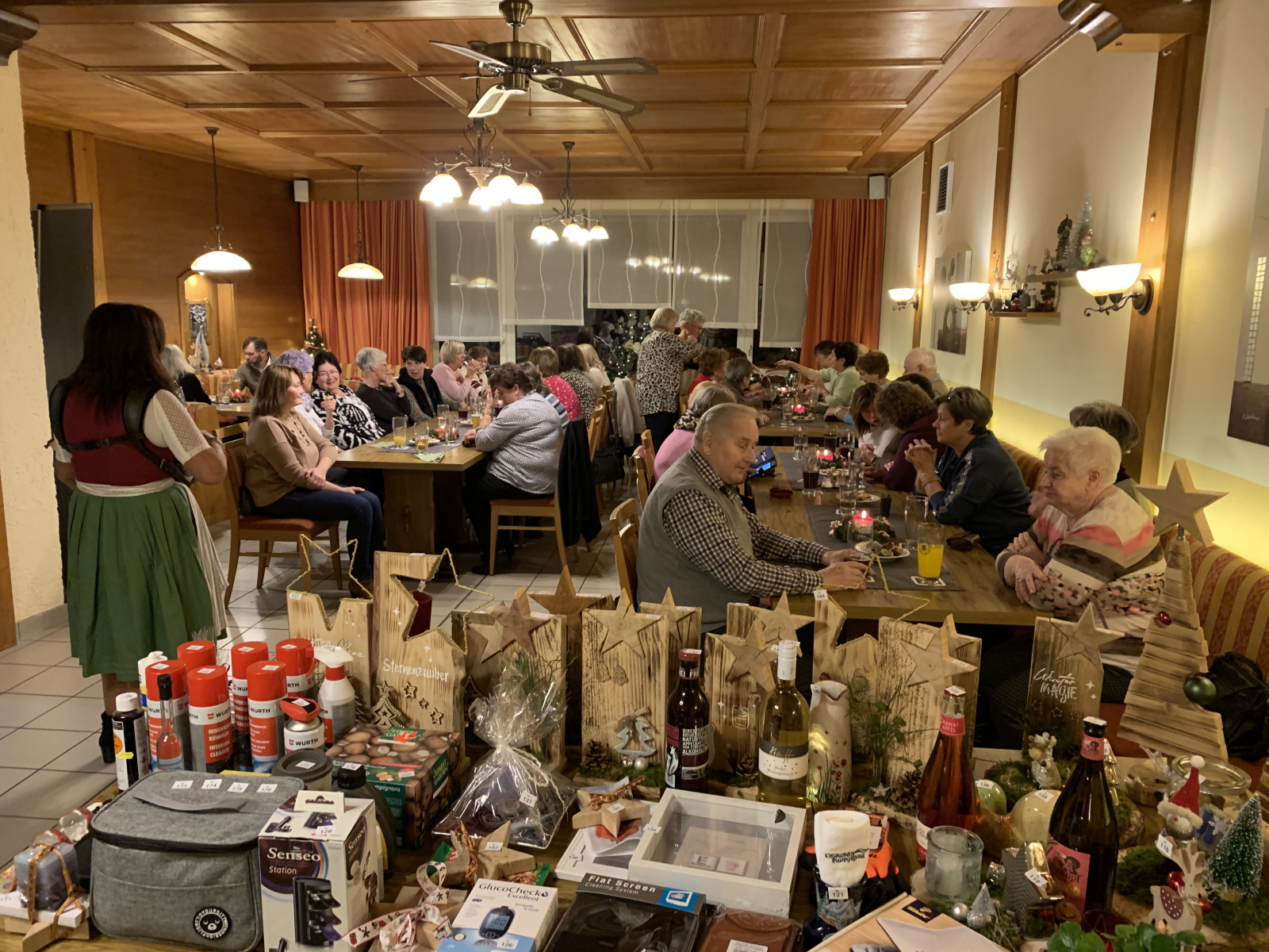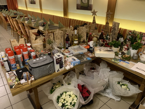 Nach dem Essen wurden die Lose für die Tombola verkauft und der ein oder andere brauchte am Ende wieder mehrere Taschen oder Schachteln um das Gewonnene nach Hause zu transportieren. Die gestrickten Mützen von Rosmarie Breitenfellener erfreuten auch wieder viele Gartler. Franz Hautzinger hatte auch wieder verschiedene Deko aus Holz gebastelt. Mit Musik von Monika und angeregten Gesprächen klang die Feier anschließend aus.