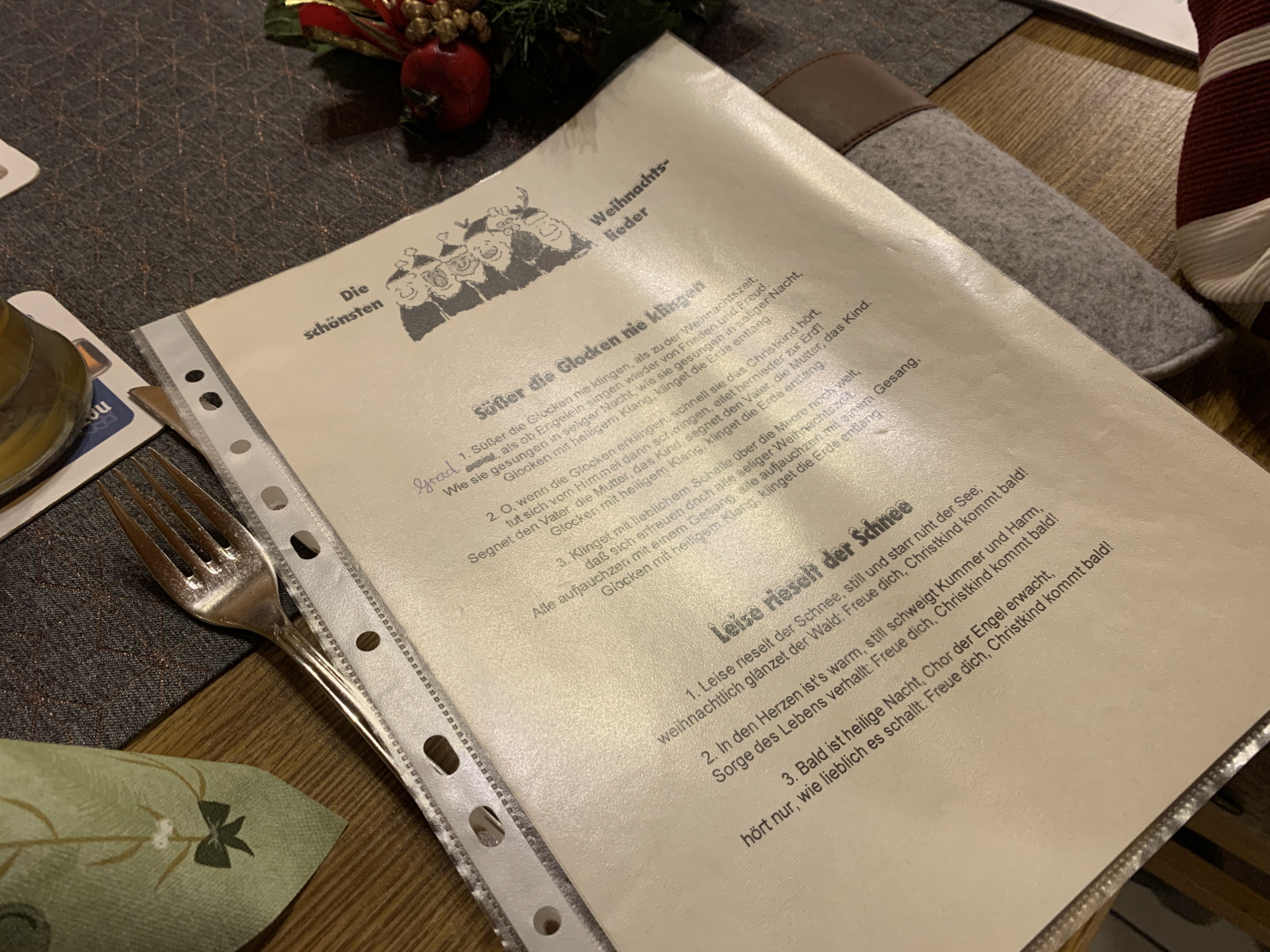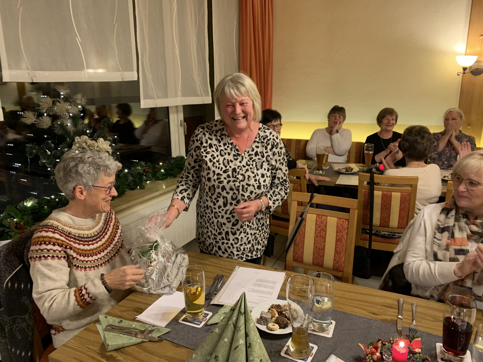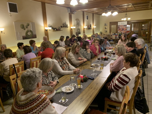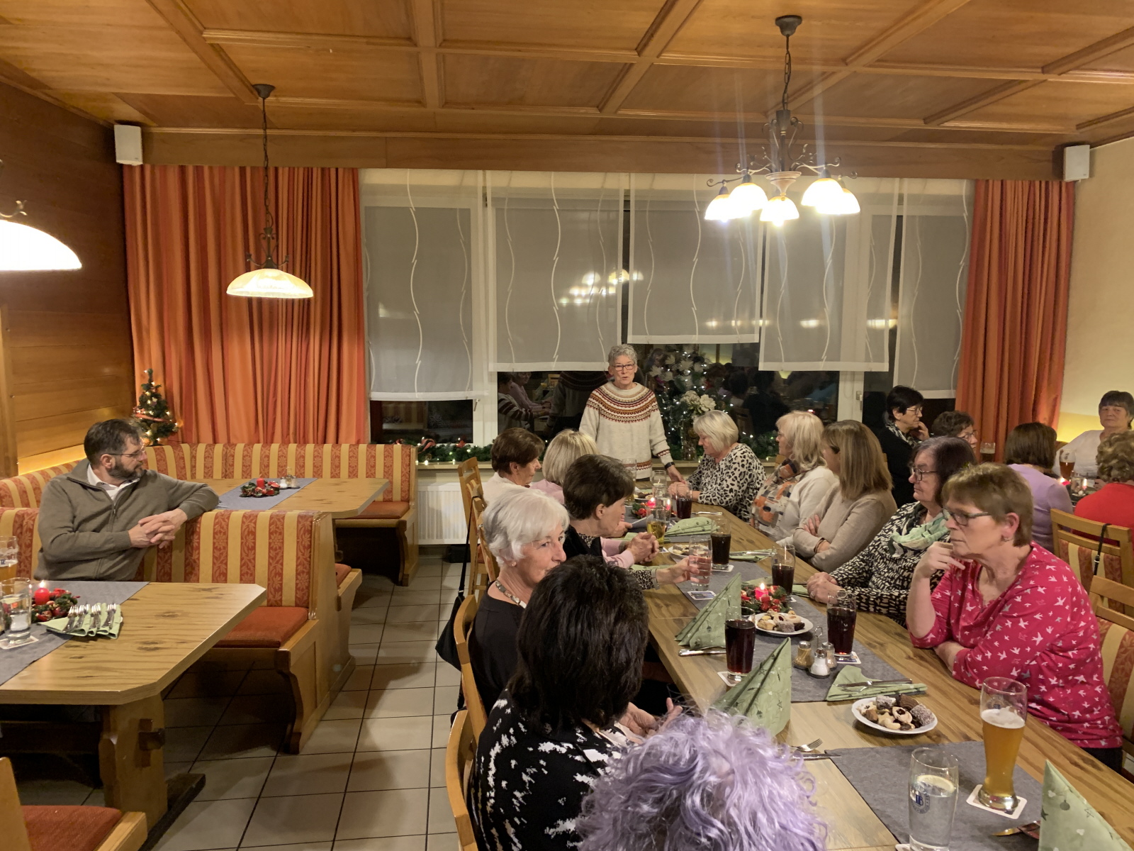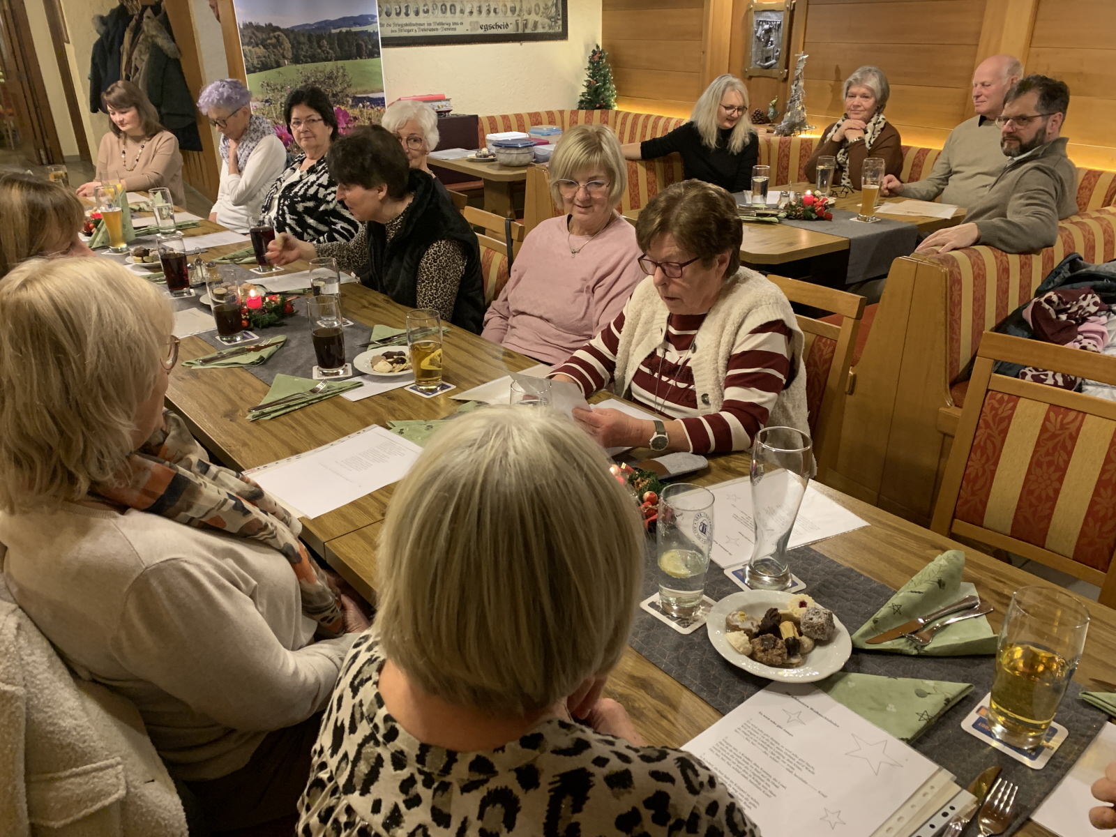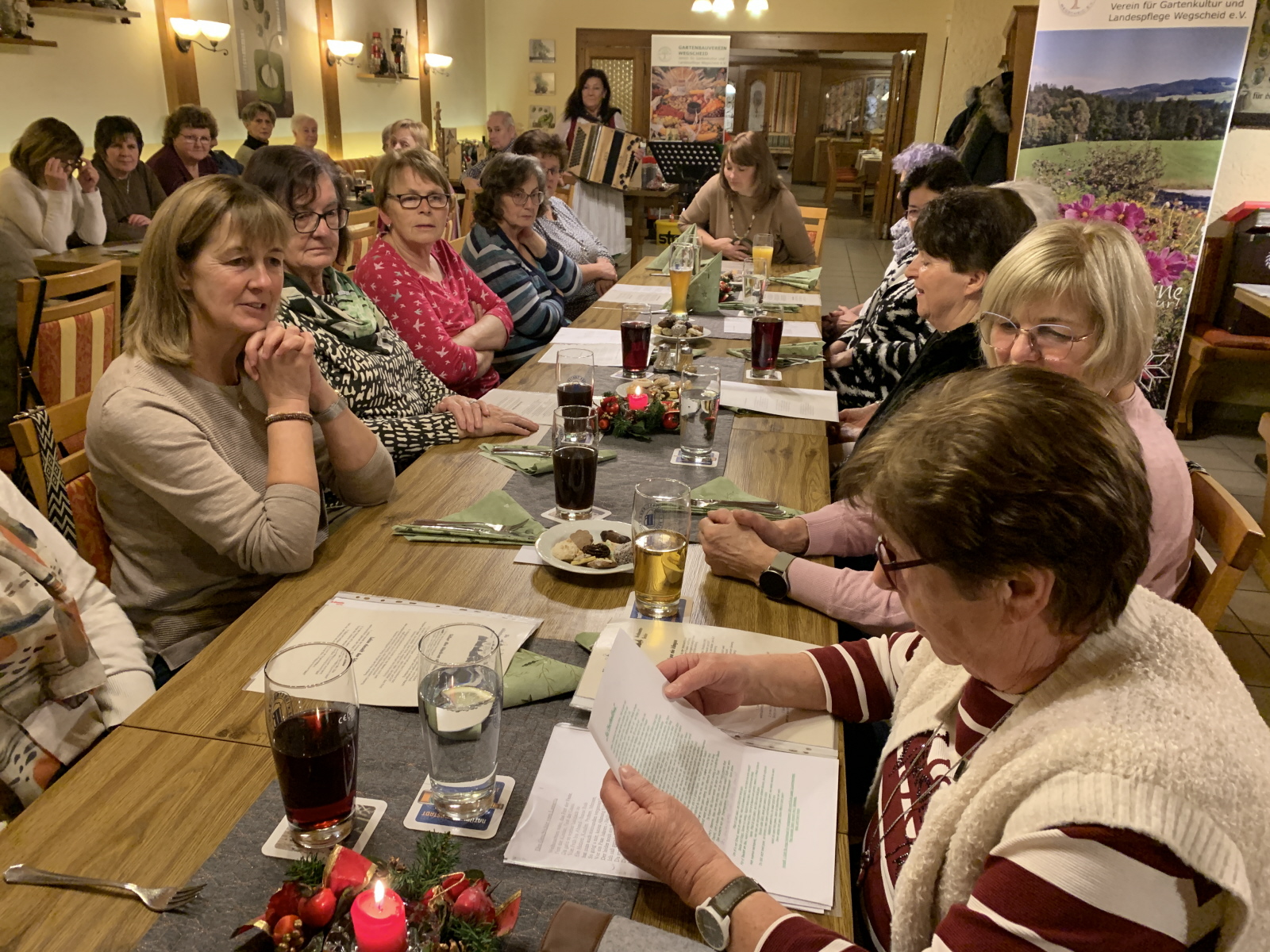 Danach las Inge Fenzl weihnachtliche Geschichten vor, unter anderem lustige Geschichten über Christbaumschmuck und fehlendes Lametta, das durch Sauerkraut ersetzt wurde. Aber auch zur aktuellen Zeit passende Geschichten mit Wünschen an das Christkind für Frieden. Im Wechsel mit den Geschichten von Inge spielte Monika Weihnachtslieder zum mitsingen.
